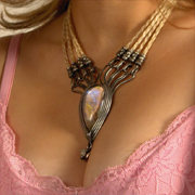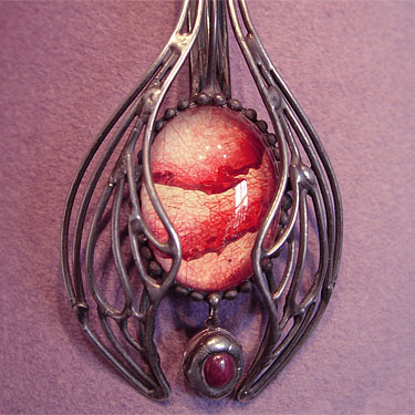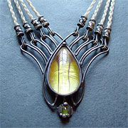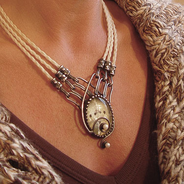 Ist die Augenfarbe im Mittelmedallion wiederholt, unterstreicht dies die Wirkung ihrer Augen. Getragen an kunstvoll geknüpftem Rosshaar verbindet es sich »wie gewachsen« mit dem Eigenhaar. Gerade weil sich das Schmuckstück an den unveränderlichen Merkmalen der Persönlichkeit orientiert, ist die Kleidung immer passend - von leger bis aufregend, von romantisch bis sportlich.